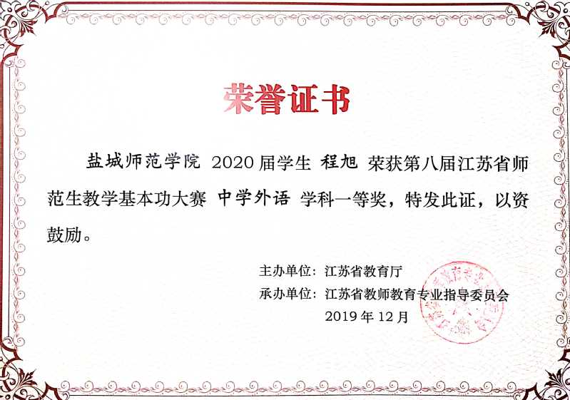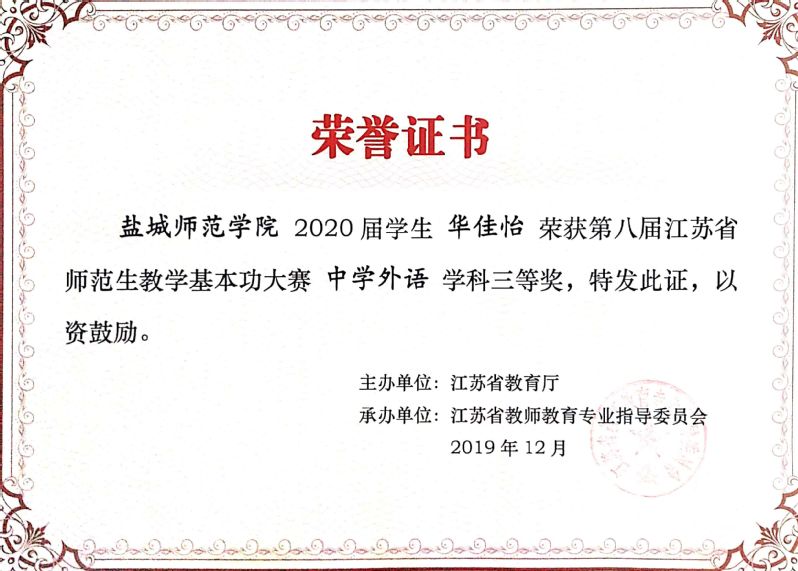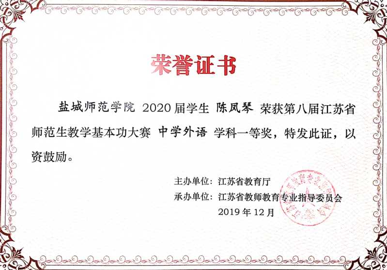 由省教育厅主办、江苏省教师教育专业指导委员会承办的第八届江苏省师范生教学基本功大赛已经圆满结束,公司陈凤琴、程旭同学获得中学外语组一等奖 ,华佳怡同学获得中学外语组三等奖。