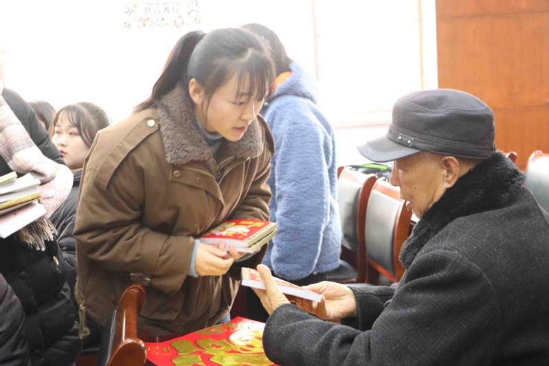 在通榆社区党员服务中心,志愿者们为社区老人带去了“中国年”文化小讲堂,用通俗易懂的语言讲述年的由来及中国年的传统习俗,给老人们送上了该公司青翼公益慈善服务中心募集的御寒冬衣,并送去福字、春联、台历等新年礼物,叮嘱他们要注意身体,春节期间户外活动要注意安全。
