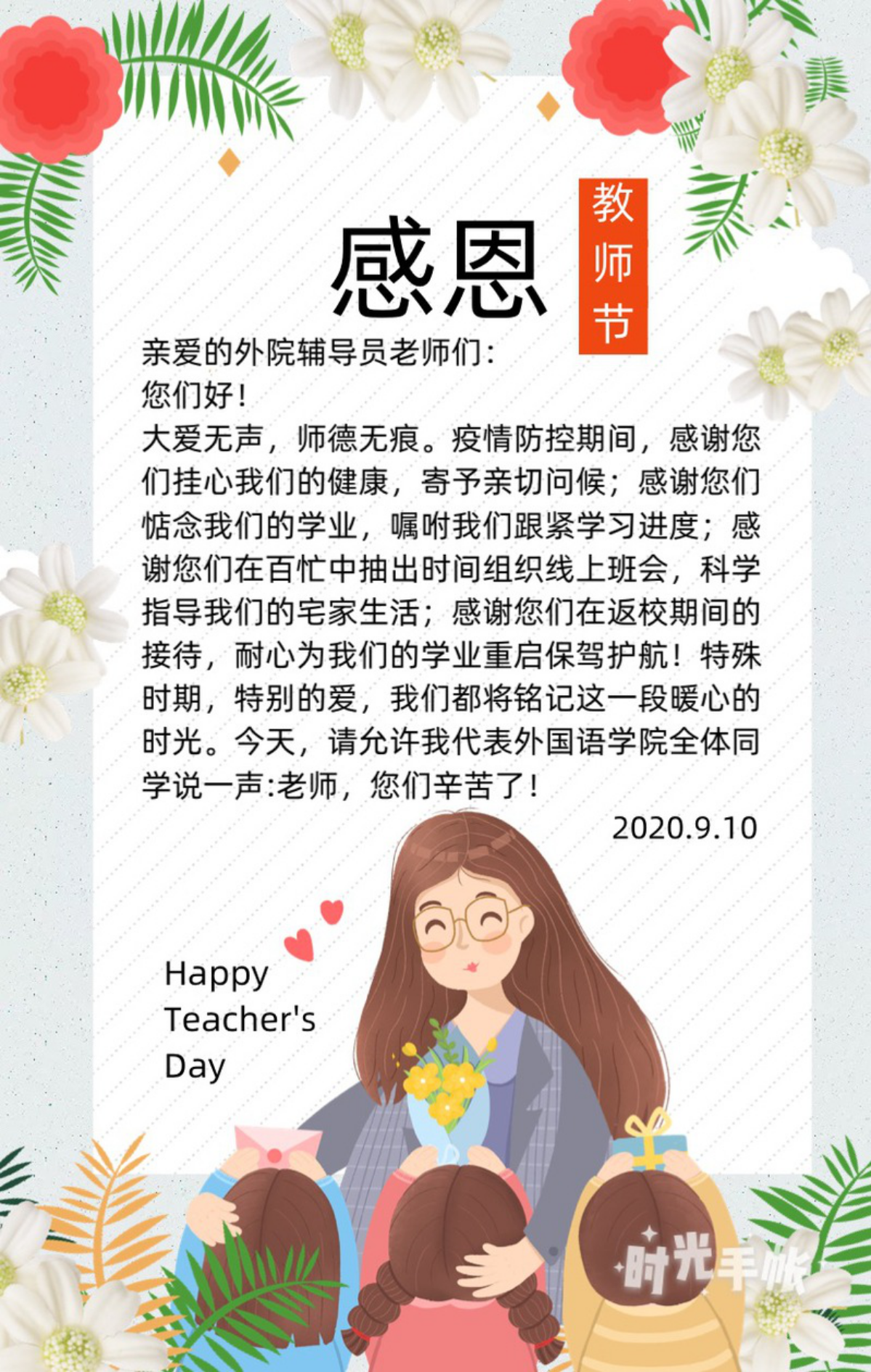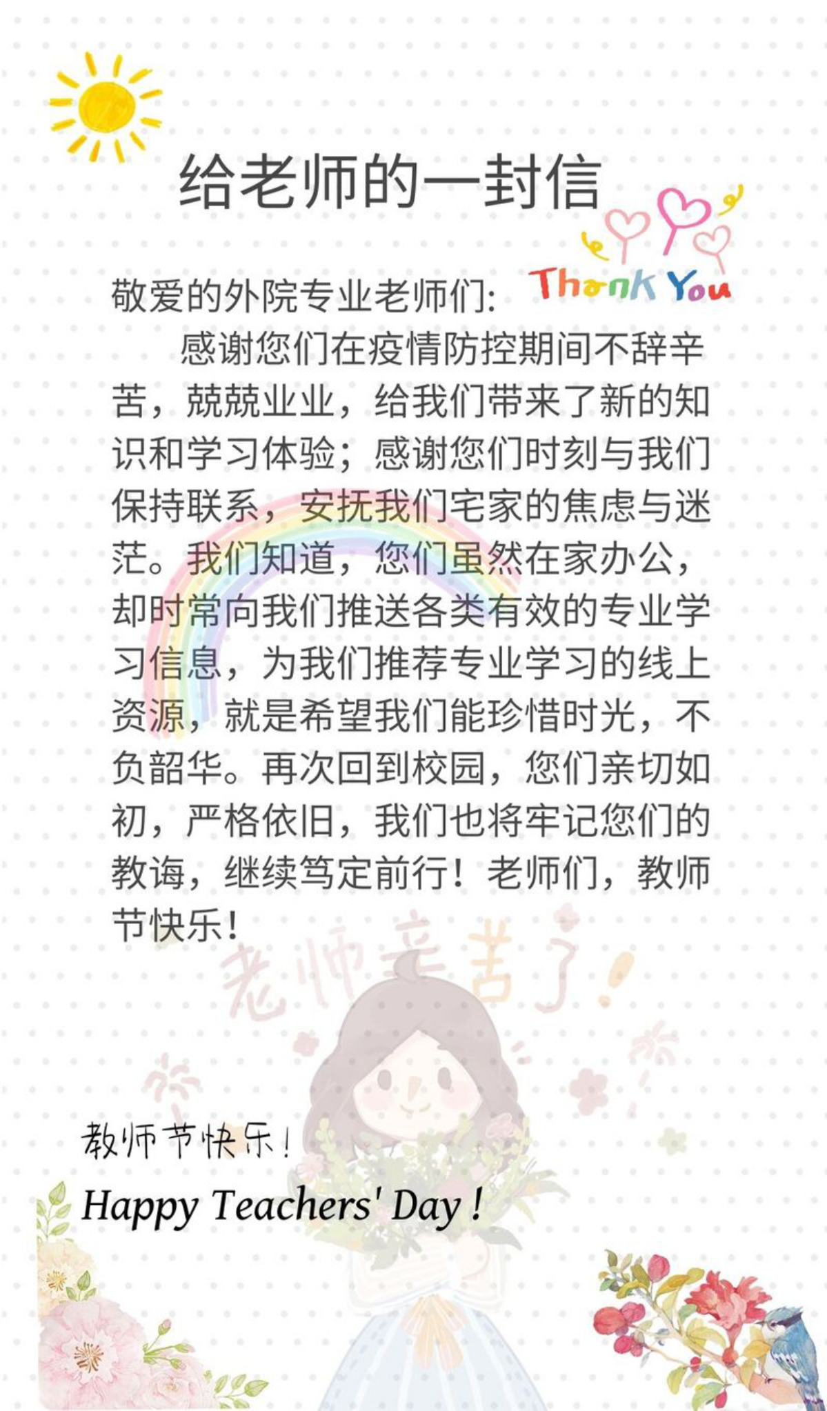 “老师,您们辛苦了,疫情期间,感谢您们一直线上陪伴宅家的我们,返校之后,感谢您们全程指导我们重启校园生活!”同学们用书信形式深情回顾了与辅导员、班主任和专业老师之间的相处点滴,感激之情溢于言表。