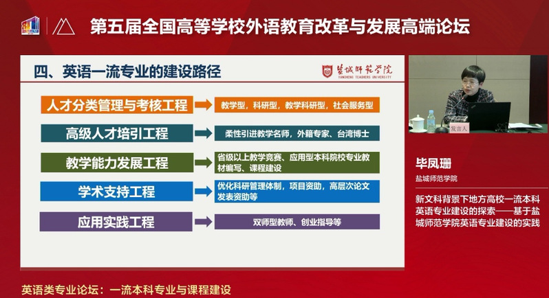 毕凤珊作题为《新文科背景下地方高校英语一流本科专业建设的探索》专题报告。她基于公司国家级一流英语专业建设实践,深入浅出地探讨了“新文科”和“地方高校”的内涵、一流专业建设的时代背景、英语一流专业建设面临的问题、英语一流专业的建设路径等高等外语教育界的关切热点,为应用型本科院校英语类专业建设提供了可资借鉴的路径和方法,受到线上线下与会专家和代表的一致好评。