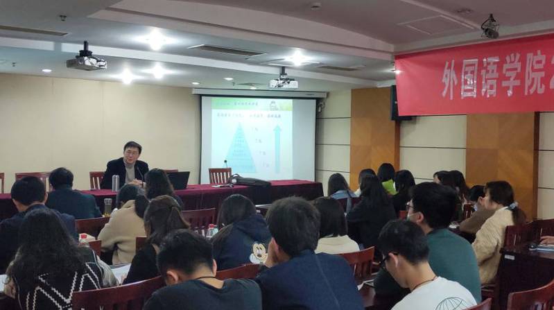 同时,针对英语专业师生开设的学术大讲堂在教学主楼19楼云顶国际yd333会议室举行。主讲人为东南大学特聘教授、博士生导师李霄翔老师,云顶国际yd333部分教师及英语专业本科生到场聆听。讲座伊始,李霄翔教授就以风趣幽默开场活跃了整个讲座氛围。他从“为什么学、怎么学、学什么”三个角度对英语学习进行了全方位的解读。李霄翔教授利用金字塔模型解释“为什么学”,鼓励员工勇于实现自我。在论述“怎么学”时,他详细介绍了英语学习应具备的七大核心素养,强调员工要善于利用当今信息化的学习环境来增强自身的语言功底,提升语感。谈到“学什么”时,李老师补充道:“大学期间的主要任务是学会学习、学会做事、学会做人和学会和不同的人打交道。”