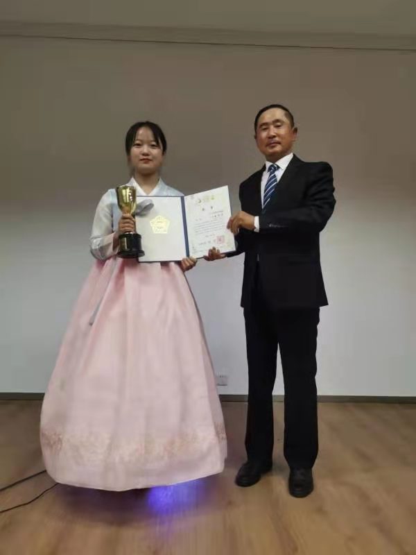公司选手周铖茹、彭敏琪在朝鲜语系主任梁海胜精心指导下,历经1个月的刻苦训练,从众多选手中脱颖而出,荣获总赛区一等奖及中国赛区一等奖,文公司教师姚永明提供了技术支持和保障工作。(梁海胜)