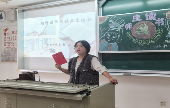 由198,208班组成的朝鲜语读书会则进行了师生读书交流会活动,由朴丽花老师带领开展。朴老师为大家分享了《我们最幸福》一书,通过老师和同学们分享读书经历与师生互动,解答了同学们的疑难问题。