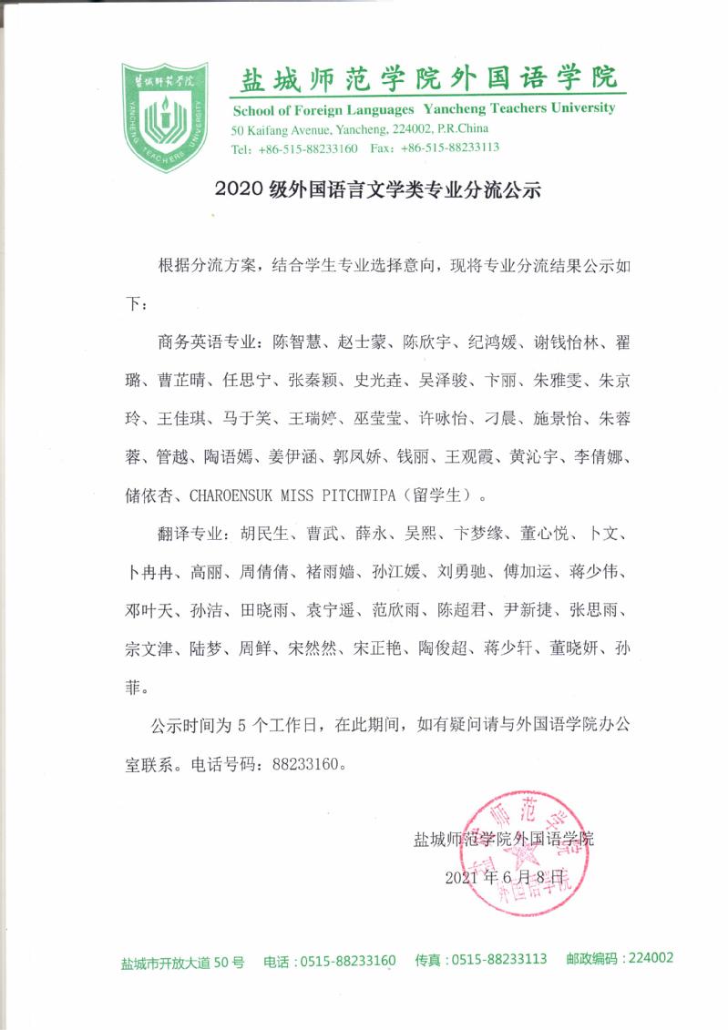2020级外国语言文学类专业大类分流名单公示