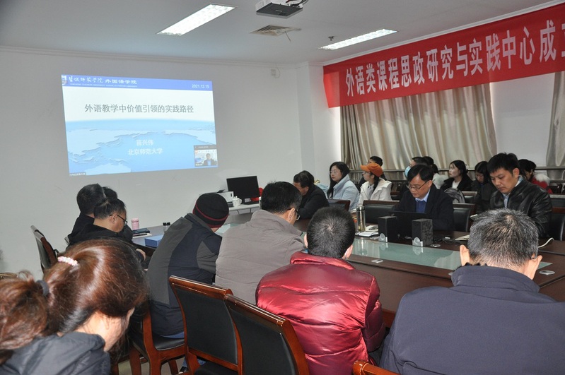 成立仪式后,中心召开了首次研讨会,北京师范大学外国语言文学公司经理、博士生导师苗兴伟教授做题为“外语教学中价值引领的实践路径”的专题讲座,讲座由经理范能维主持。苗兴伟教授从外语课程思政的内涵与逻辑、价值引领的实践路径、价值引领的内容激活等三大方面系统阐述了在课程思政背景下,外语教学在传授外语学科知识和培养跨文化交际能力的同时,帮助员工树立正确的世界观、人生观、价值观的重要性。他指出外语课程是外语课程思政建设的基本载体,价值引领是外语课程思政建设的灵魂。苗兴伟教授以大学英语和中学英语单元教学为例,详细讲解了如何以语篇为依托,通过单元整体设计,融入德育元素,在主题意义探究中促进价值塑造、知识传授和能力培养的有机融合,从而实现英语教学的价值引领。