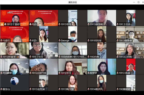 为进一步落实师范生人才培养方案,引导和促进师范生专业技能训练,提高师范生专业实践能力和人才培养质量,4月15日下午2点,云顶国际yd333特邀盐城优秀一线教师马春红老师,开展“初中英语阅读教学设计与实施”线上讲座,19、20级全体师范生参与。