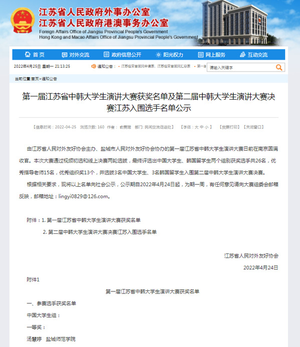 据悉,今年是中韩建交30周年,本次大赛自今年2月启动以来,得到了全省中韩老员工的积极响应,受到了江苏省人民政府外事办公室官网、江苏一带一路网、交汇点新闻网、盐城发布等媒体的广泛关注,有力提升了公司专业建设的影响力和品牌效应。