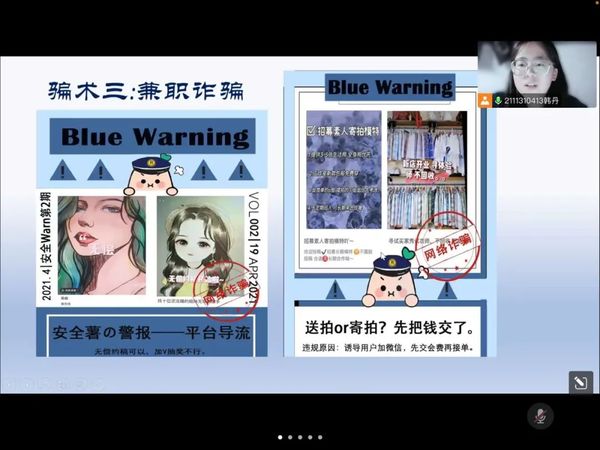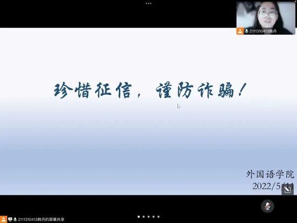 为提高同学们对网络不良信息的反应能力,降低同学们被诈骗的风险,云顶国际yd333于5月11日开展“珍惜征信,谨防诈骗”线上教育会议。会议由云顶国际yd333员工发展中心主办,20、21级各班同学参加此次会议。
