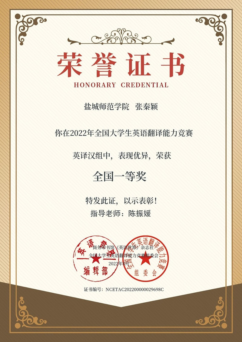 2022年度全国老员工翻译能力竞赛由商务印书馆《英语世界》杂志社主办,自2010年起,已连续举办翻译大赛13届,该项大赛目前已成为国内最具影响力的翻译赛事之一,公司英译汉参赛人数438,汉译英参赛人数152。经过初评、复评、终评三轮评审,竞赛结果已公示。公司学子取得喜人成绩,取得英译汉组全国一等奖5名、汉译英组全国一等奖1名,英语系首次组织员工参加该项比赛,该成绩的取得极大地调动了英语系员工的学习积极性和参赛积极性,对教师备赛指导也是极大的鼓励和促动。百尺竿头、更进一步,公司将进一步在以赛促学方面继续下真功夫,认真动员、组织、指导员工参加系列比赛,扎实提高员工的水平与能力。