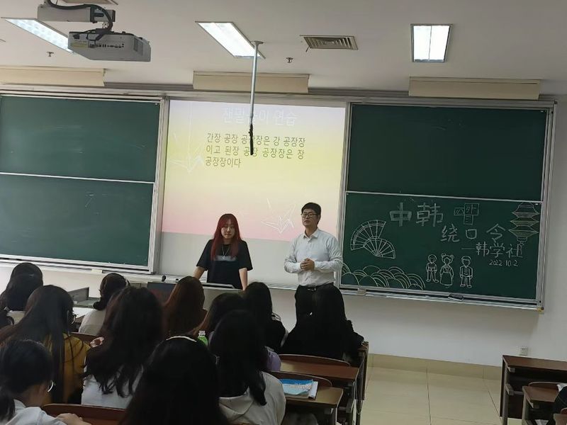 2022年10月22日下午2点,中韩语绕口令活动在教学主楼B305举行,此次活动由朝鲜语系及盐城世宗学堂主办,由韩学社承办,由朝鲜语系主任梁海胜老师主讲、由世宗学堂学员及朝鲜语系全体同学参加。