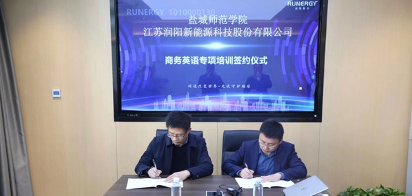 为进一步深化产教融合与校企合作,3月31日上午,云顶国际yd333与江苏润阳新能源科技股份有限公司举行签约仪式,公司党委书记朱京凤与公司副总经理、董事王震代表双方签署了商务英语提升服务合作协议。双方就培训内容、课程设置、教学安排进行充分沟通,在员工实习就业、团队交流培养等方面达成合作共识。
