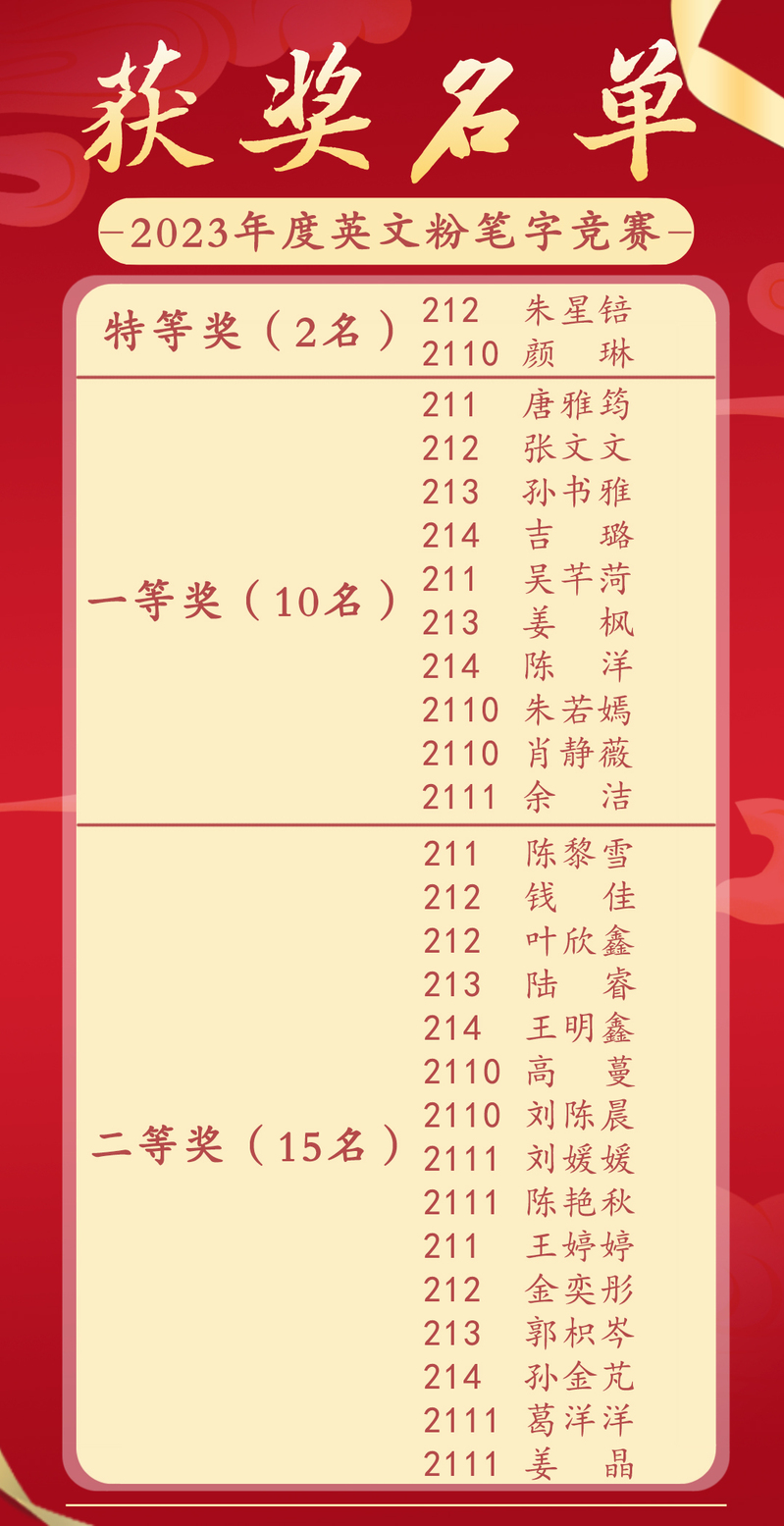 本次决赛经过前期21级英语专业全年级范围的初赛选拔,共有27名选手脱颖而出进入决赛。最后评选出特等奖2名,一等奖10名和二等奖15名。经过激烈的角逐,颜琳同学、朱星锫同学荣获特等奖。