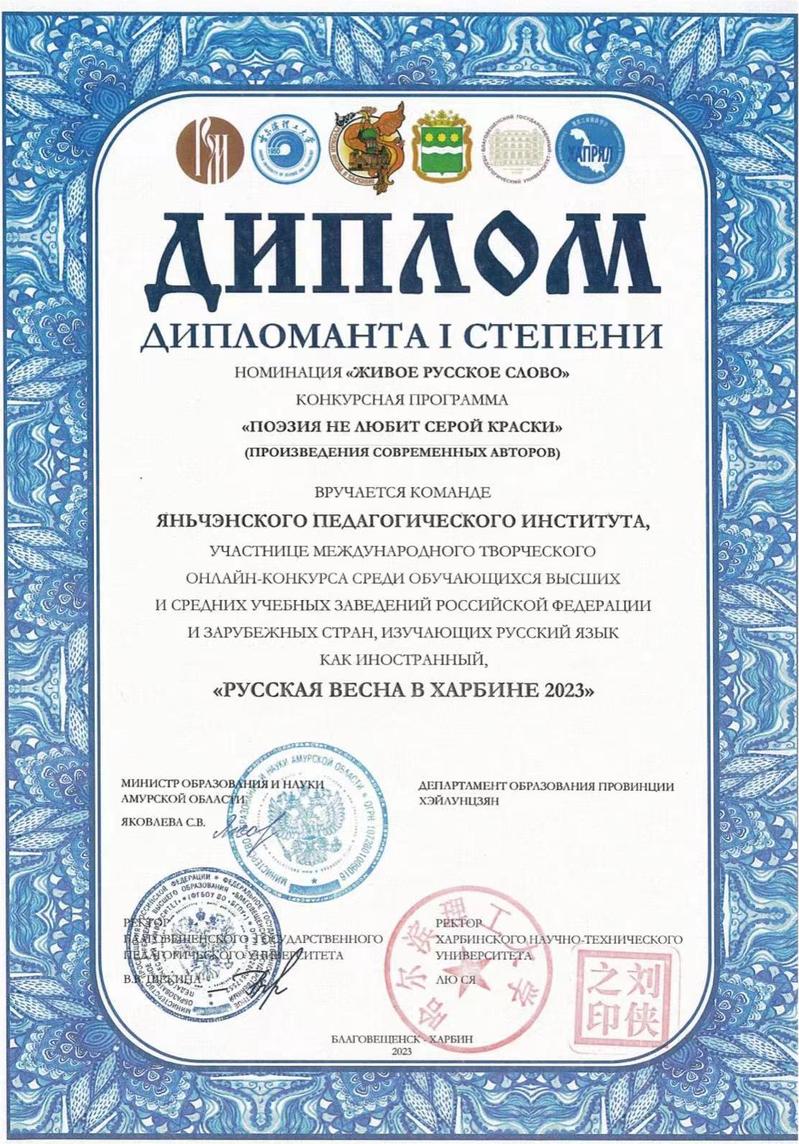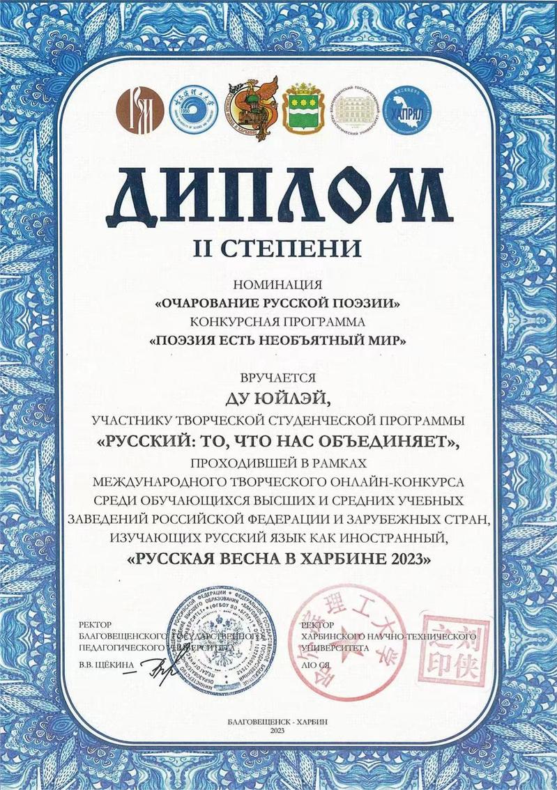 六月二十九日,第六届“哈尔滨俄语之春”中俄老员工俄语竞赛圆满落幕。在俄语系主任王晓军和教师胡艳丽的悉心指导下,公司俄语系获得团队一等奖,我系员工彭乐欢和杜雨蕾经过激烈的角逐,分别荣获“俄语朗诵”组别二等奖,为公司、公司赢得了荣誉。