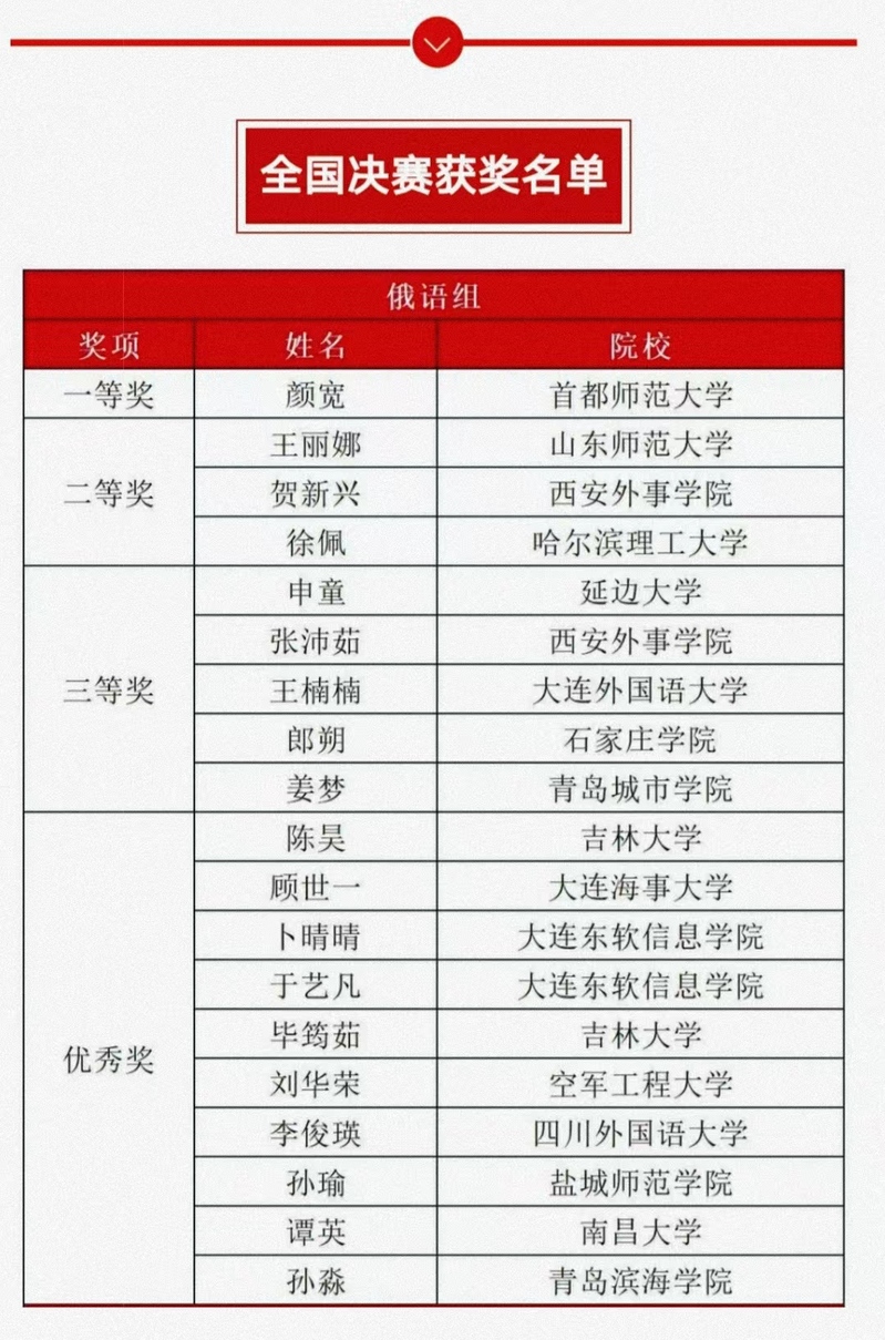 近日,由北京外国语大学中国外语与教育研究中心、北京外国语大学中国外语教材研究中心、北京外国语大学中国外语测评中心和外语教学与研究出版社共同举办的2023外研社多语种"教学之星"大赛圆满落下帷幕。大赛自启动以来,全国共有116所高校197位参赛教师进入决赛。公司俄语系教师孙瑜荣获俄语专业组优秀奖,位列全国第17名。