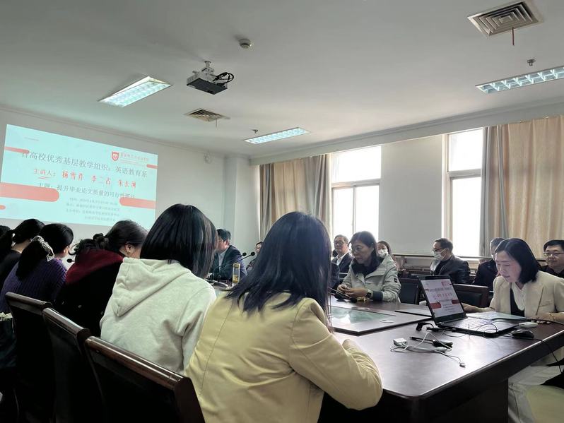 英语教育系于2022年秋被评为江苏省高校优秀基层教学组织。为充分发挥基层教学组织作用、更好地迎接公司产品审核评估工作、进一步提升本科毕业论文质量、进一步深化公司公司产品改革、全面提升本科教学工作水平和人才培养质量、帮助论文指导教师进一步了解英语类本科毕业论文的基本要求、选题原则、资料搜集方法、论文写作方法,在校教师发展中心的精心部署下,4月17日下午,英语教育系在主楼13楼东会议室开展主题为“提升毕业论文质量的可行路径”的教研活动,云顶国际yd333副经理于胜博、英语教育系主任杨丹、刘岩及所有论文指导教师参与活动。