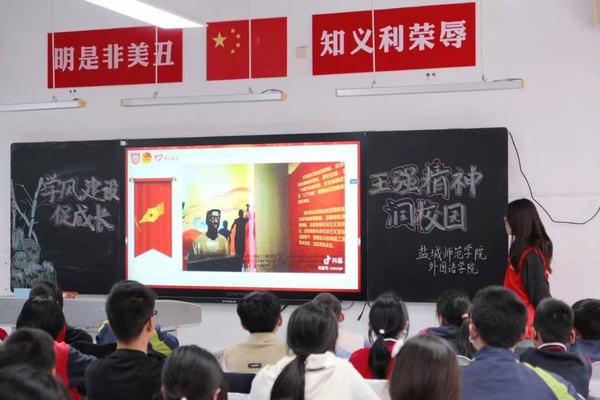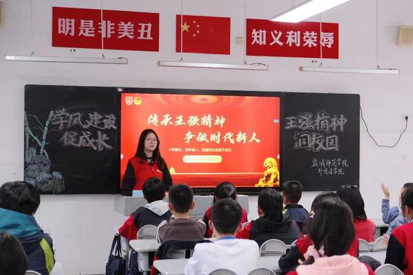 在附属中学七(4)班的课堂上,主讲人顾欣月向同学们介绍了王强老师的生平:王强老师坚持用信仰托起梦想,用责任撑起担当,让使命超越生命。80年代的300元捐款,练习板书的小黑板,与病魔抗争4年间,完成1部20万字的专著,11篇核心期刊论文,指导28名员工完成毕业论文,帮助修改5部专著和12篇论文……王强老师的事迹和精神所折射的社会主义核心价值观光辉,给同学们留下了深刻印象,带来了强烈心灵震撼。随后,顾欣月组织同学们讨论学习生活中的难题挑战,鼓励同学们学习践行王强精神,不惧困难,将王强精神内化于心,外化于形,做一个有理想、肯担当、求上进、愿付出的时代新人。
