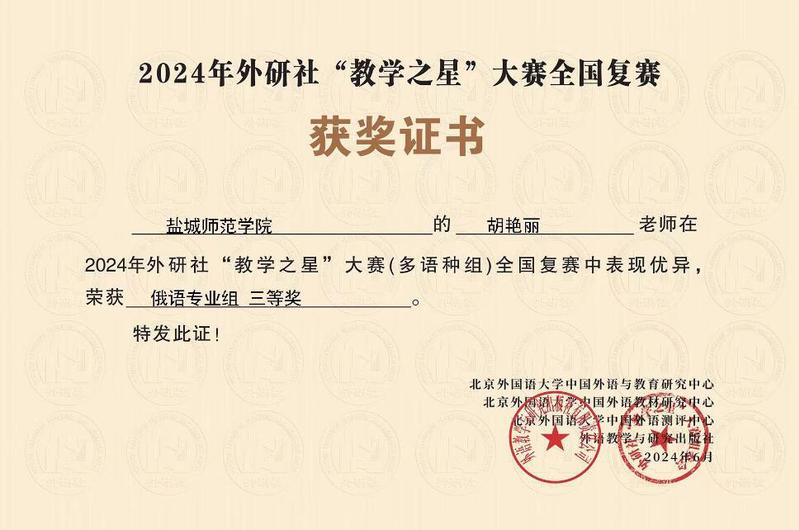 6月19日,2024年外研社“教学之星”大赛全国复赛落下帷幕,经过激烈角逐,我系教师胡艳丽荣获全国复赛俄语专业组三等奖。