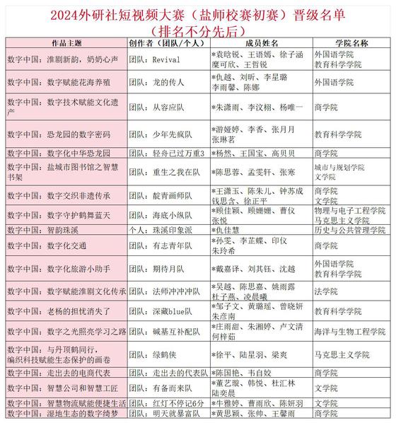 所有参与本次初赛选拔的团队均从指导教师团队的选题及思路指导的培训及指导中受益良多,所有晋级成功的团队将在接下来的决赛准备中发扬盐师人不怕苦、不怕累的顽强拼搏精神,在决赛中发挥出水平,用短视频形式讲好“数字中国”故事。