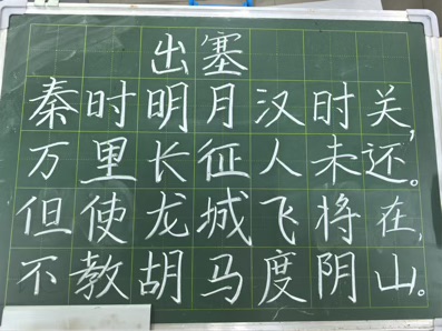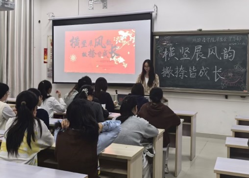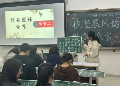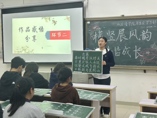 作品感悟分享环节中,各位选手更是各展所长。他们不仅用粉笔书写了文字之美,更深情讲解了文字背后所蕴含着的文化底蕴。外24(8)法语班的邱寒涵同学,手持《出塞》之作,以慷慨激昂的语调,将我们带入了烽火连天的塞外:“塞外烽烟四起,战鼓擂擂,匈奴人随时都有可能侵入边境。刀光剑影,战士们举起吹毛利刃,喊着谁与争锋的口号,前仆后继,不惧流血与牺牲,将个人生死与国家危亡紧密相连。”台上,选手们个个神采飞扬,他们将作品背后的故事与情感娓娓道来,令人动容。