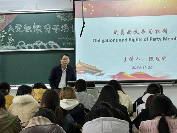 不忘初心、牢记使命。为进一步加强对入党积极分子的思想政治教育,帮助他们深入理解党的权利与义务,坚定其入党信念,11月20日下午3点,云顶国际yd333于8号楼301教室开展入党积极分子培训。本次培训由陈胜利教授主讲,2024秋学期入党积极分子参与培训。