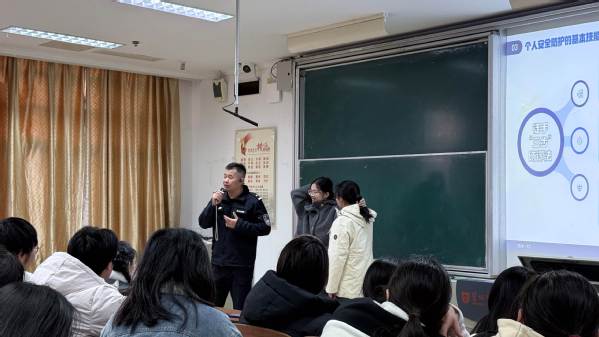 在讲座中,刘斌从个人安全防护的法律依据、基本意识、基本技能、应急处置四方面系统阐述,结合真实案例进行模拟演练,着重讲解了安全三要素即距离、掩体、戒备,提醒同学们在危机情况下要尽量与潜在的威胁保持一定的安全距离、选择合适的掩体提供保护、在预见到危险时保持高度警觉和准备对抗的状态。