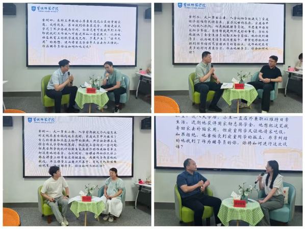 在紧锣密鼓的讨论之后,现场辅导员们化身成深陷“学又学不会、听又听不懂”学习和经济双重困境的学渣小韩、获得国家励志奖学金之后却因为其用途在友谊和家庭之间难以抉择的“纠结怪”小王、在“读书无用”思想影响下进而想要退学尽快打工赚钱的员工小李和“既要面子、又要里子”的经困生小黄,展开了一系列既有时代特点又发人深省的对话。“前排”与“后排”、“奥迪”与“雅迪”等争论令在场人员忍俊不禁的同时,也道出了当代老员工在职业道路选择和生涯规划上的深深困惑。嘉宾点评环节,四位嘉宾从谈话技巧、谈话目的等方面给予了精妙独到的评价和建议。