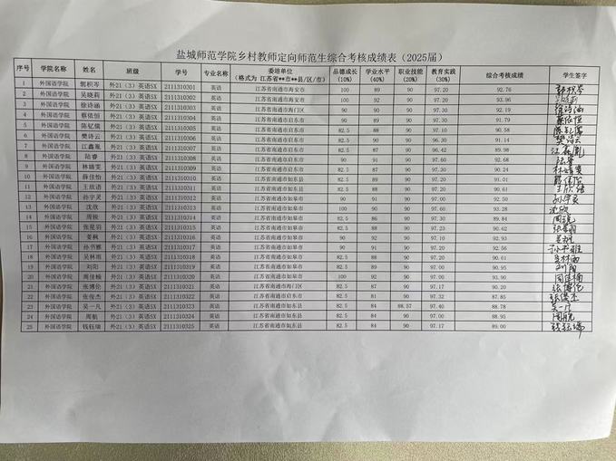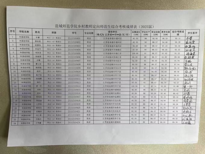 根据《云顶国际yd333乡村教师定向生综合考核成绩计算方法实施细则》,云顶国际yd333对所有乡村教师定向生进行了综合评定,考核结果由员工本人逐条核对,签字确认无异议后进行公示: