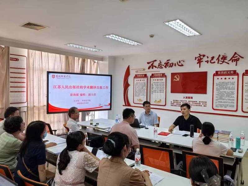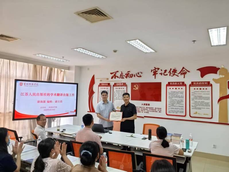 2025年6月18日,江苏人民出版社学术图书出版中心康海源副主任应邀来院,作“江苏人民出版社的学术翻译出版工作”学术报告。经理周海明为其颁发翻译专业行业导师聘书,翻译系全体教师、中华学术外译项目申报教师参会。
